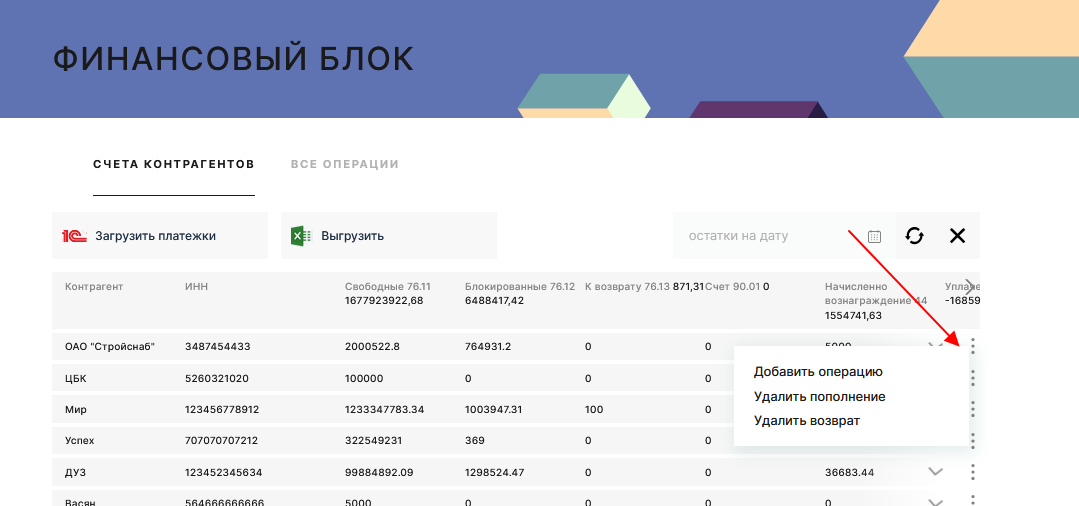 Финансовый блок включает раздел управления денежными средсвами на ЭТП "Счета контрагентов" и бухгалтерский раздел "Все операции".