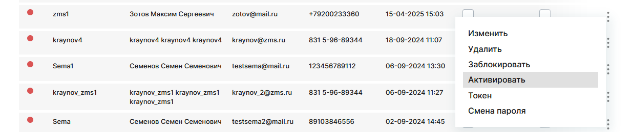 Заблокировать/Разблокировать- блокировка/разблокировка пользователя.
