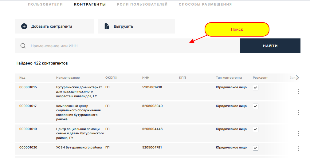 Добавить контрагента- добавление контрагента без регистрации пользователем.